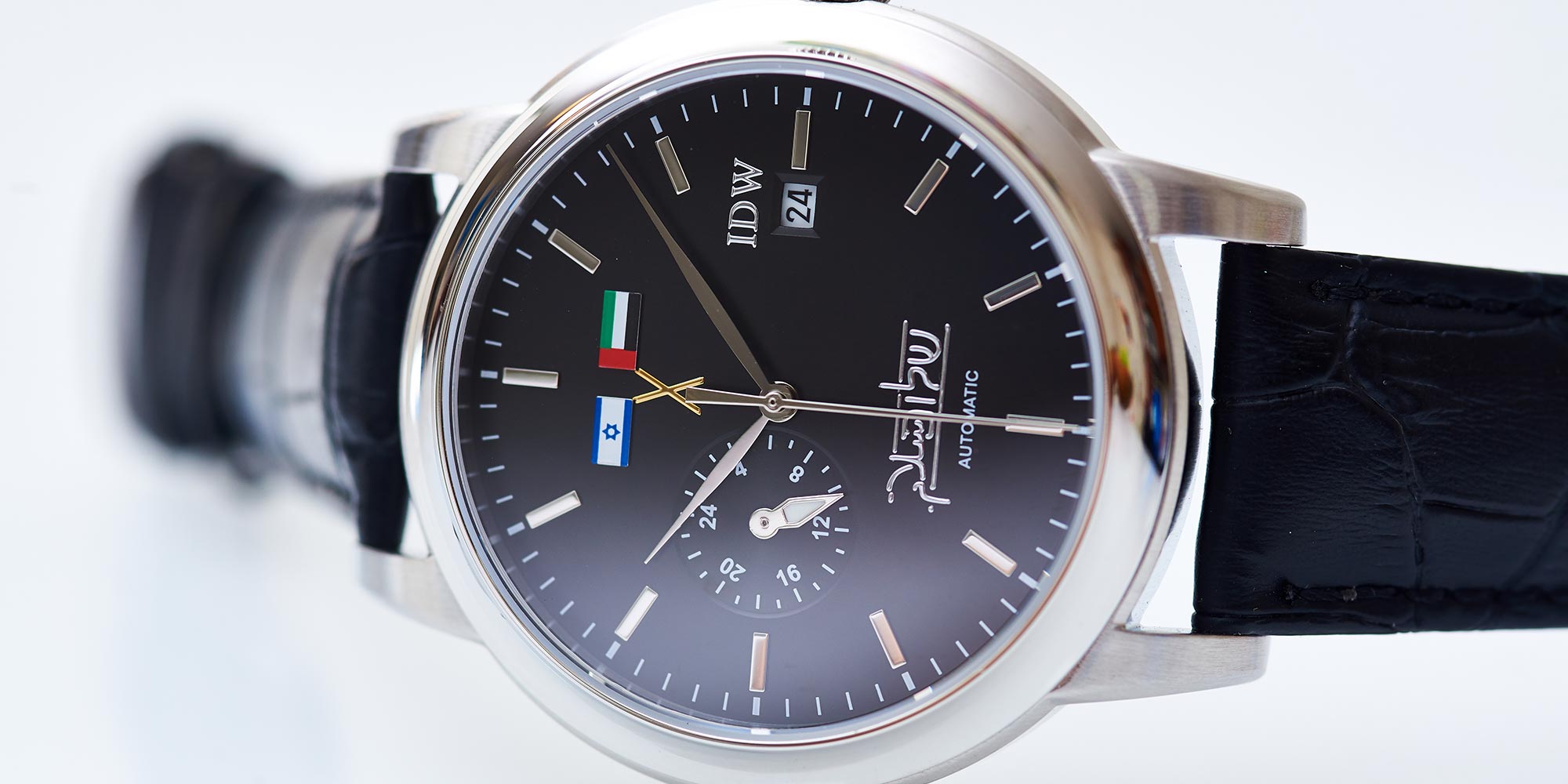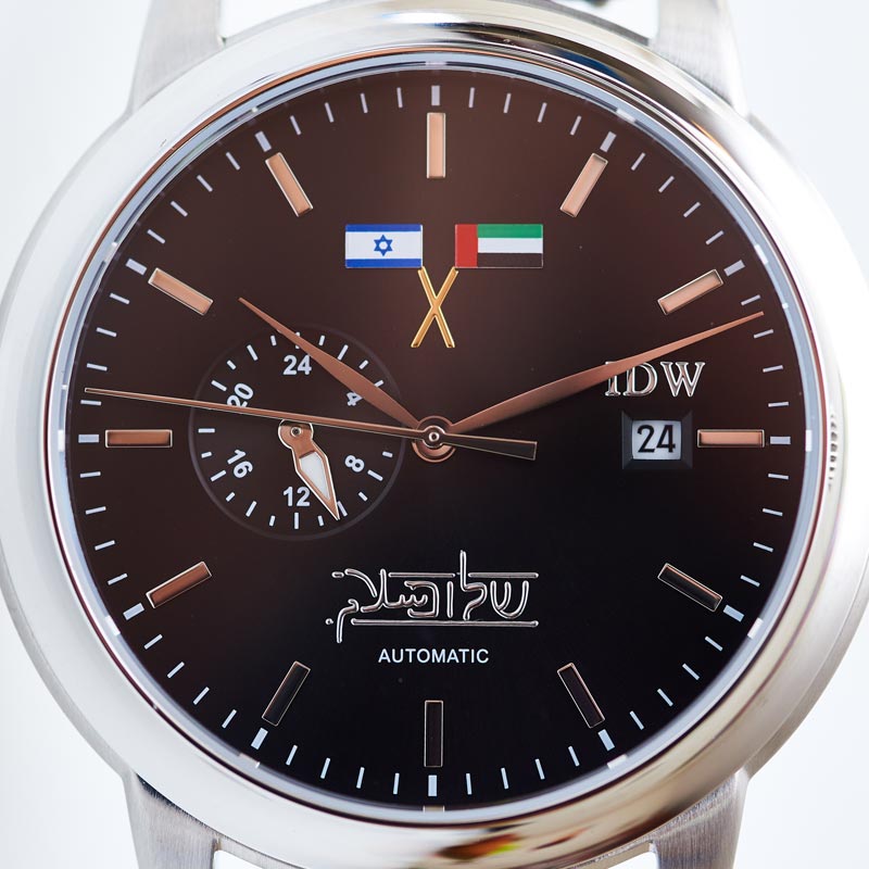 A peace motif on the dial sees the Hebrew word for peace, Shalom, end where the Arabic word, Salam, begins